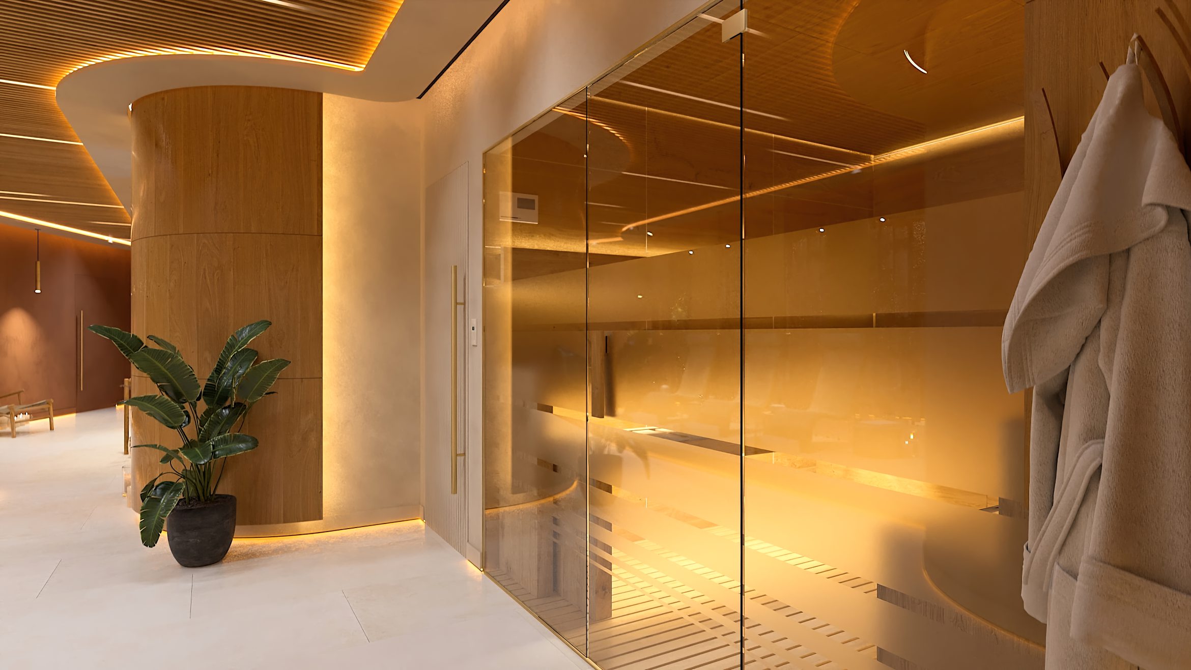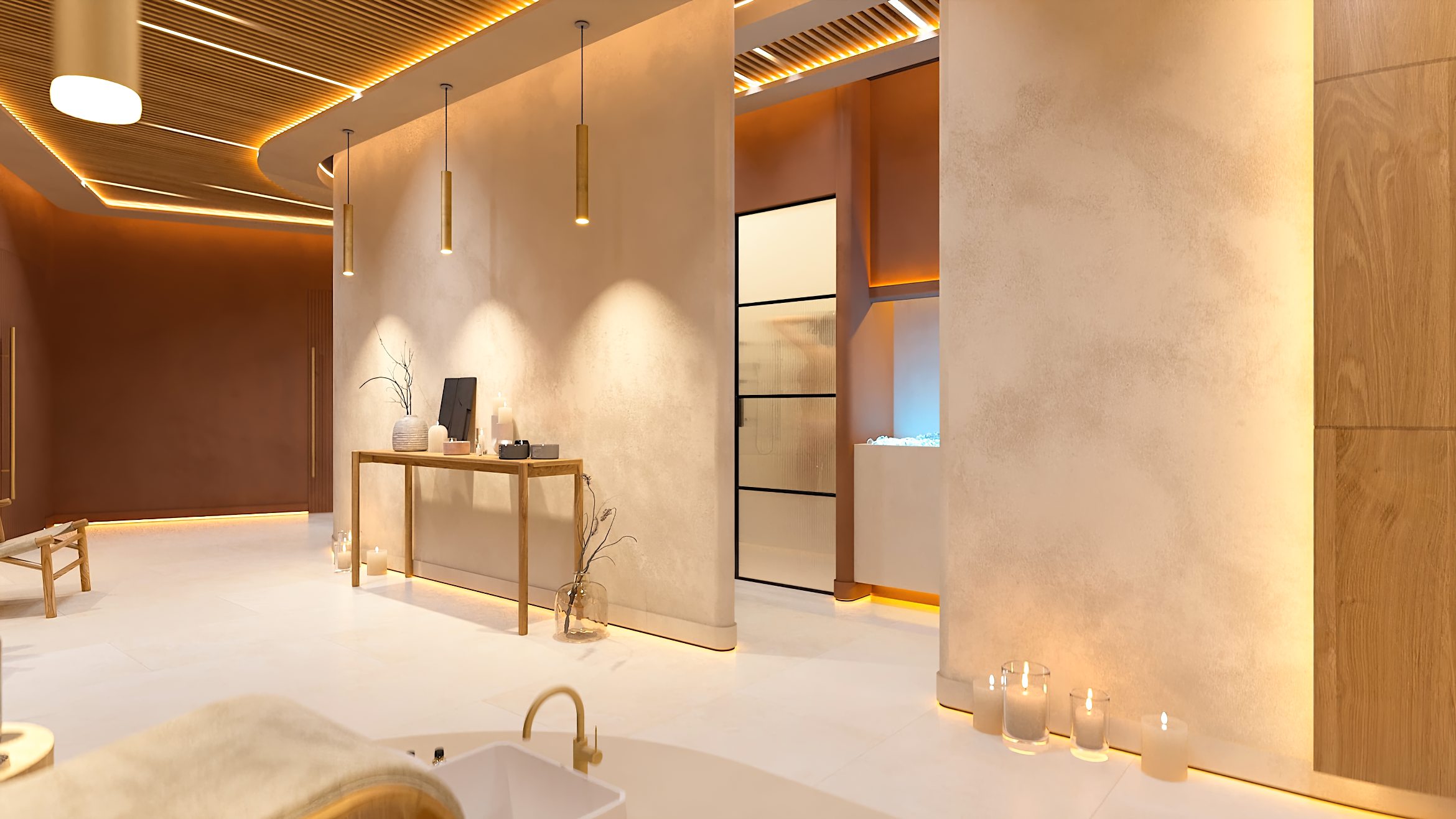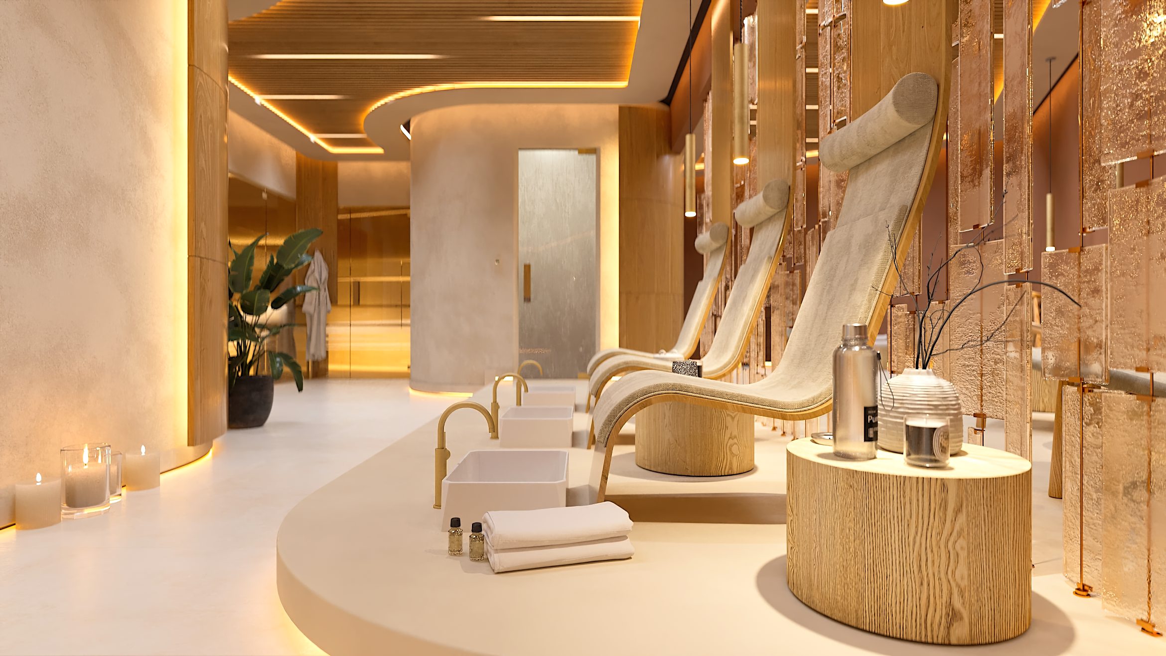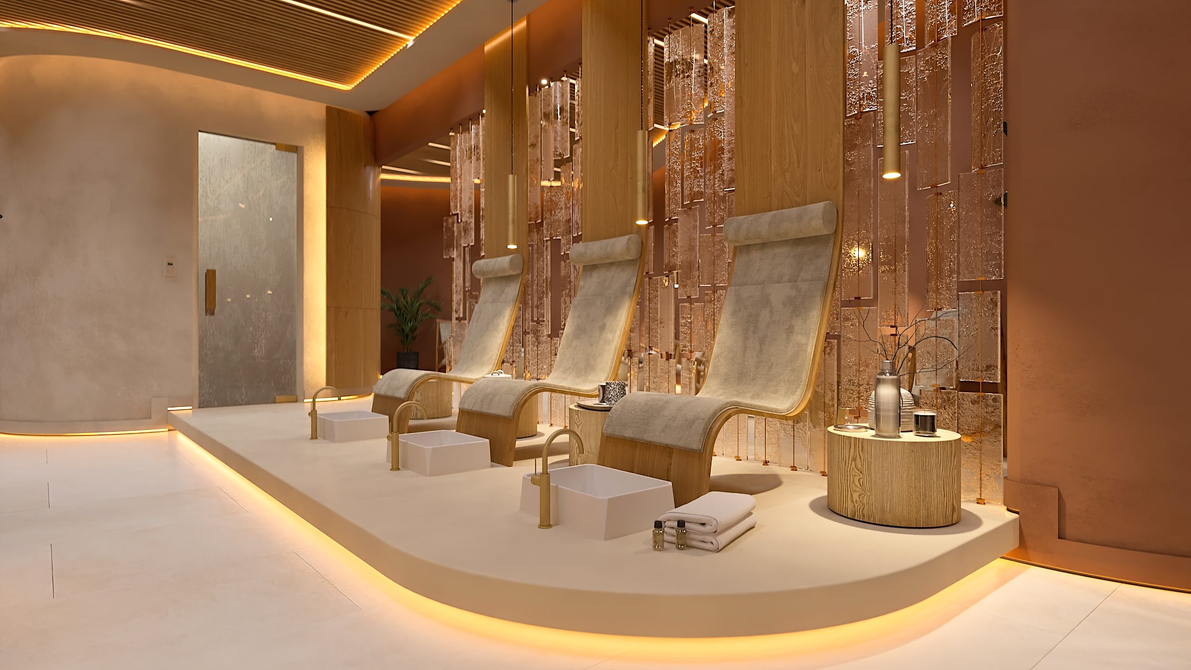 Die Formgebung des Raumes unterstreicht seinen umhüllenden Charakter. Abgerundete Linien, sanfte Kurven und fließende Übergänge in der Architektur und in der Inneneinrichtung erzeugen ein Gefühl von Geborgenheit und Harmonie und helfen den Gästen des SPA-Zentrums, sich vollständig in die Atmosphäre der Entspannung einzufinden.