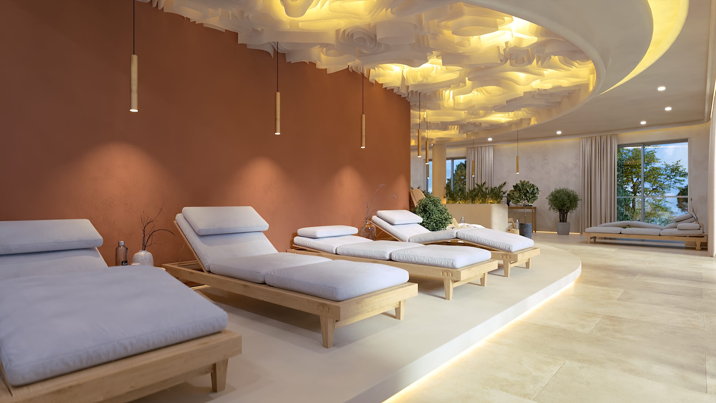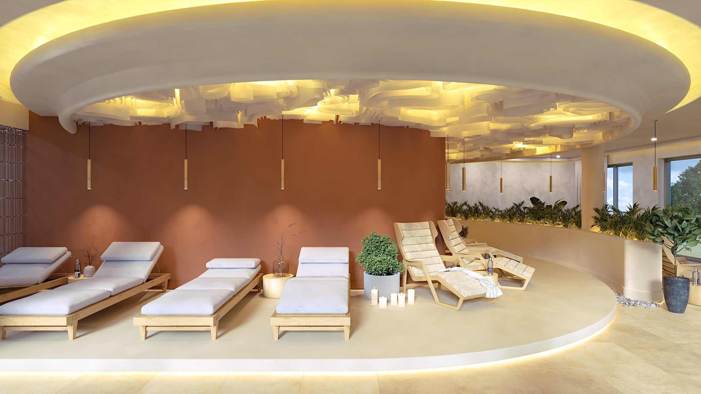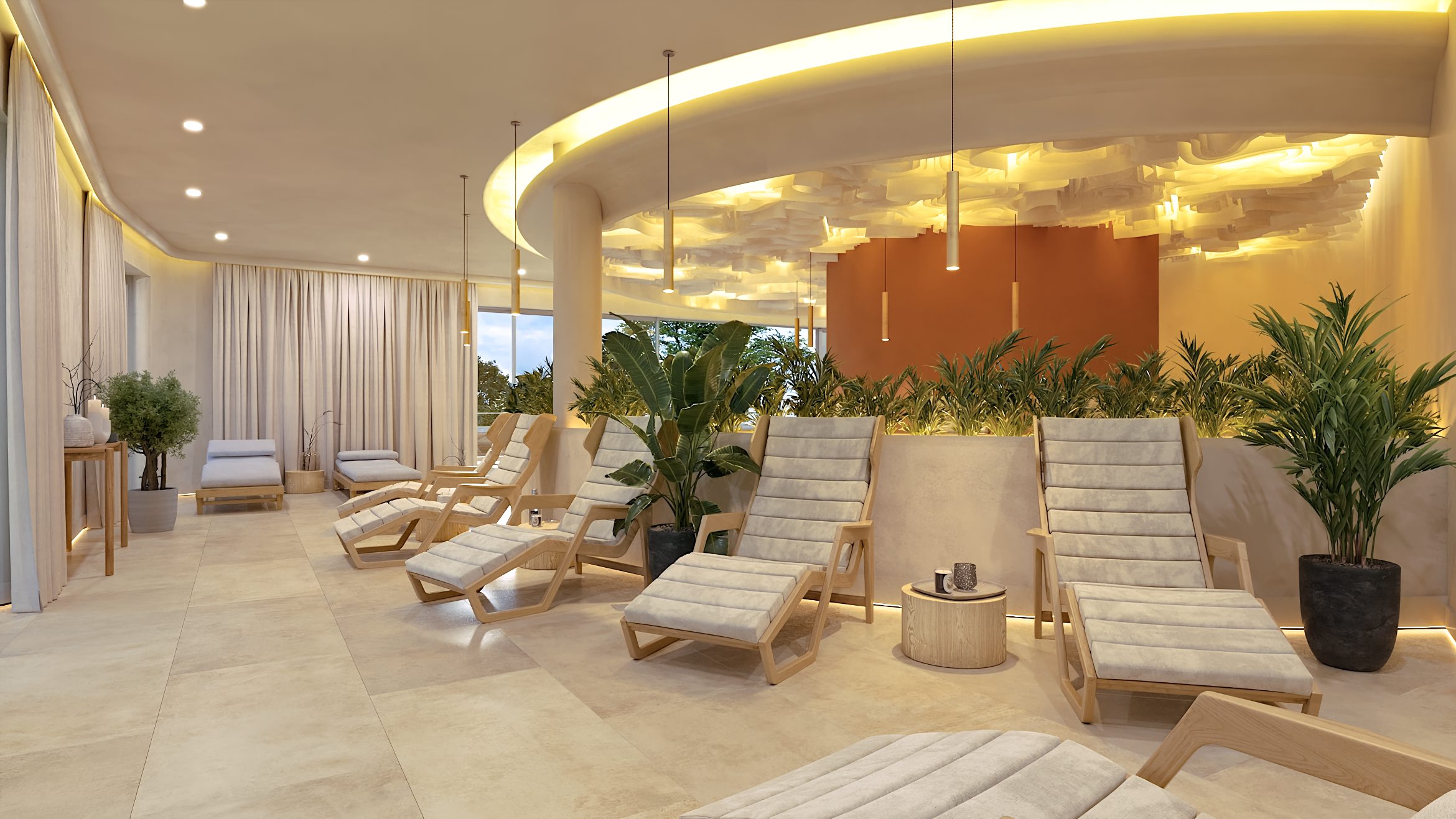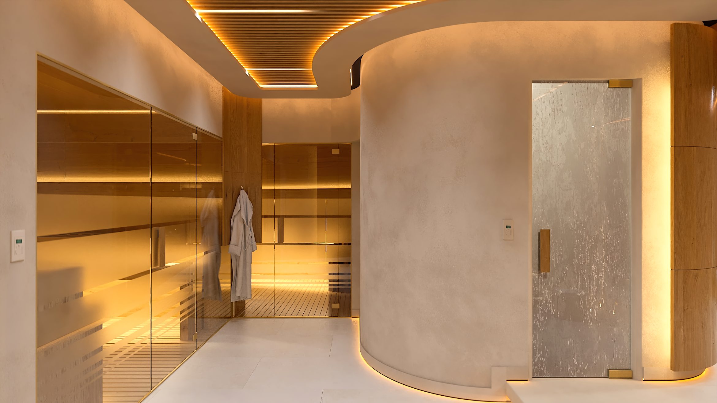 Die Formgebung des Raumes unterstreicht seinen umhüllenden Charakter. Abgerundete Linien, sanfte Kurven und fließende Übergänge in der Architektur und in der Inneneinrichtung erzeugen ein Gefühl von Geborgenheit und Harmonie und helfen den Gästen des SPA-Zentrums, sich vollständig in die Atmosphäre der Entspannung einzufinden.