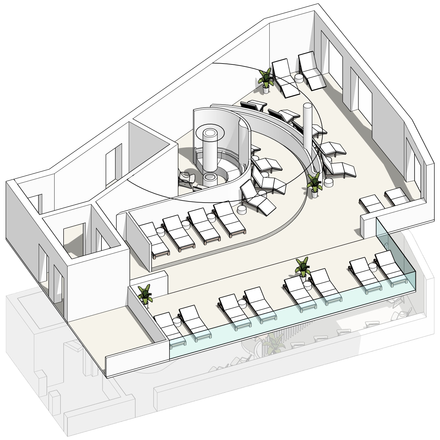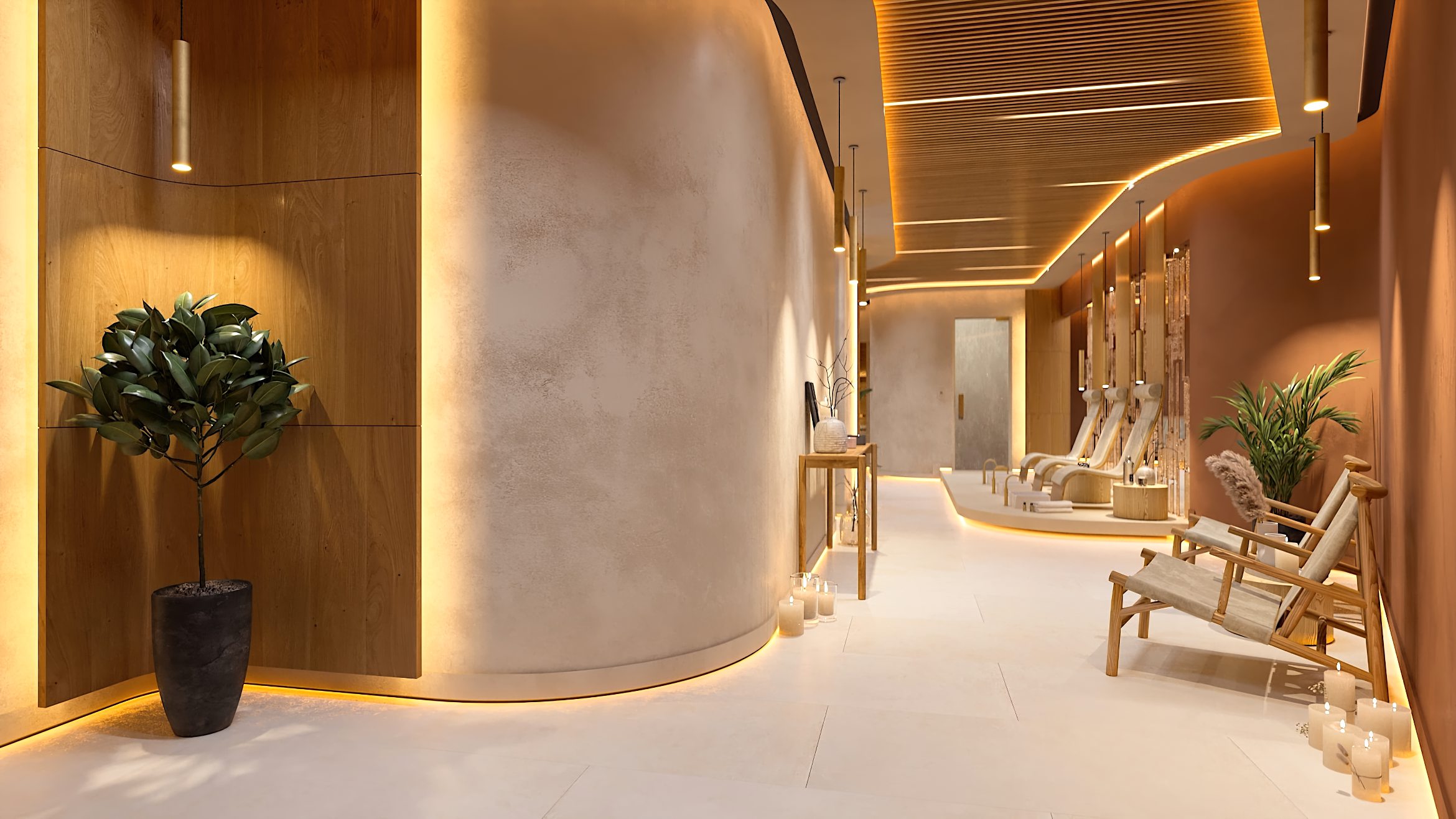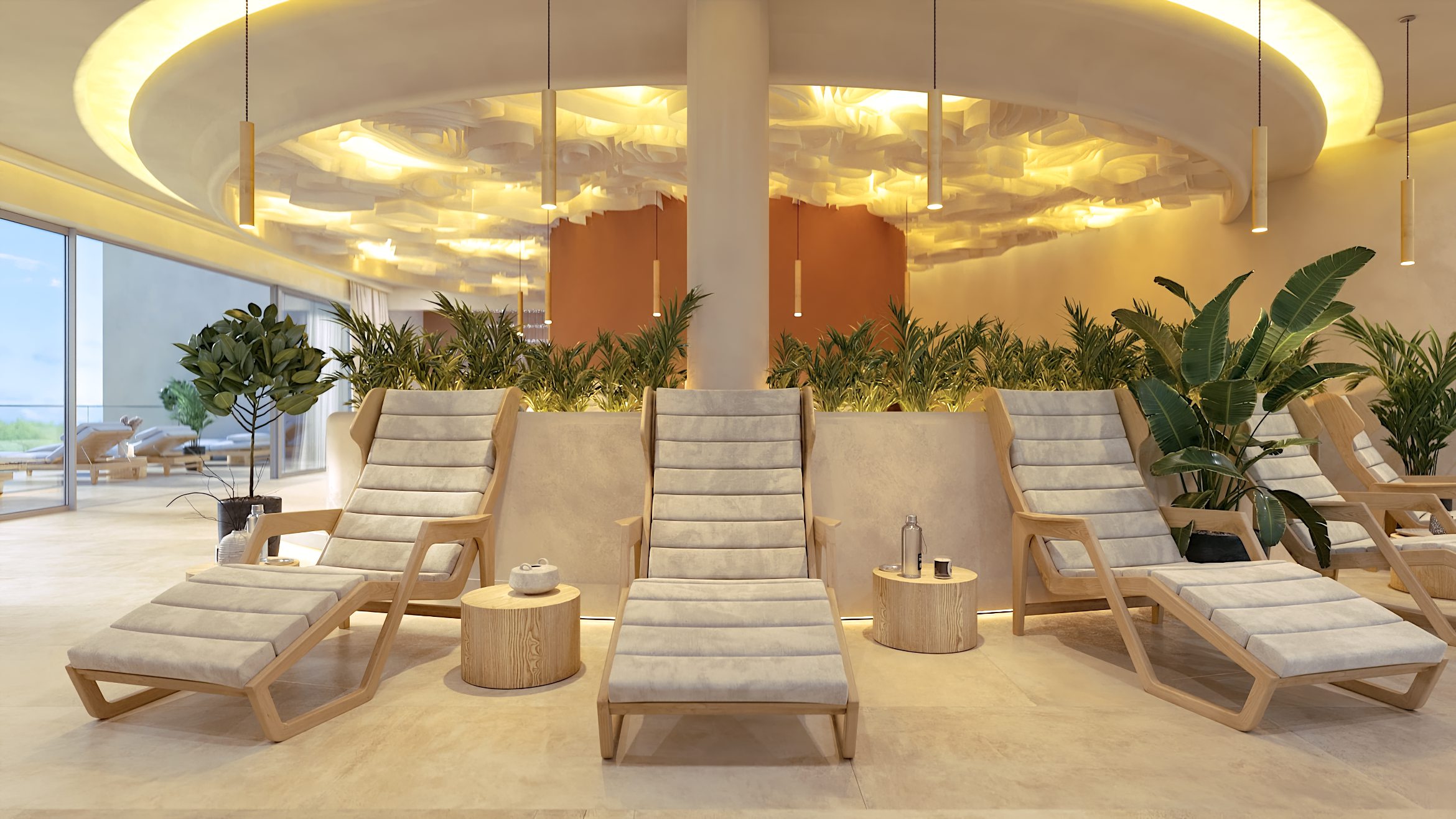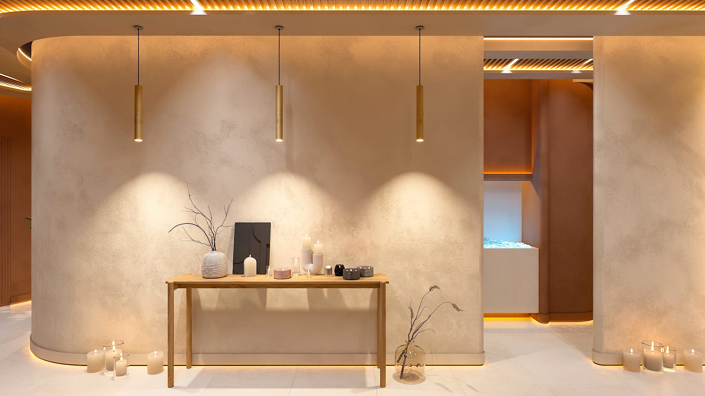 Die Formgebung des Raumes unterstreicht seinen umhüllenden Charakter. Abgerundete Linien, sanfte Kurven und fließende Übergänge in der Architektur und in der Inneneinrichtung erzeugen ein Gefühl von Geborgenheit und Harmonie und helfen den Gästen des SPA-Zentrums, sich vollständig in die Atmosphäre der Entspannung einzufinden.