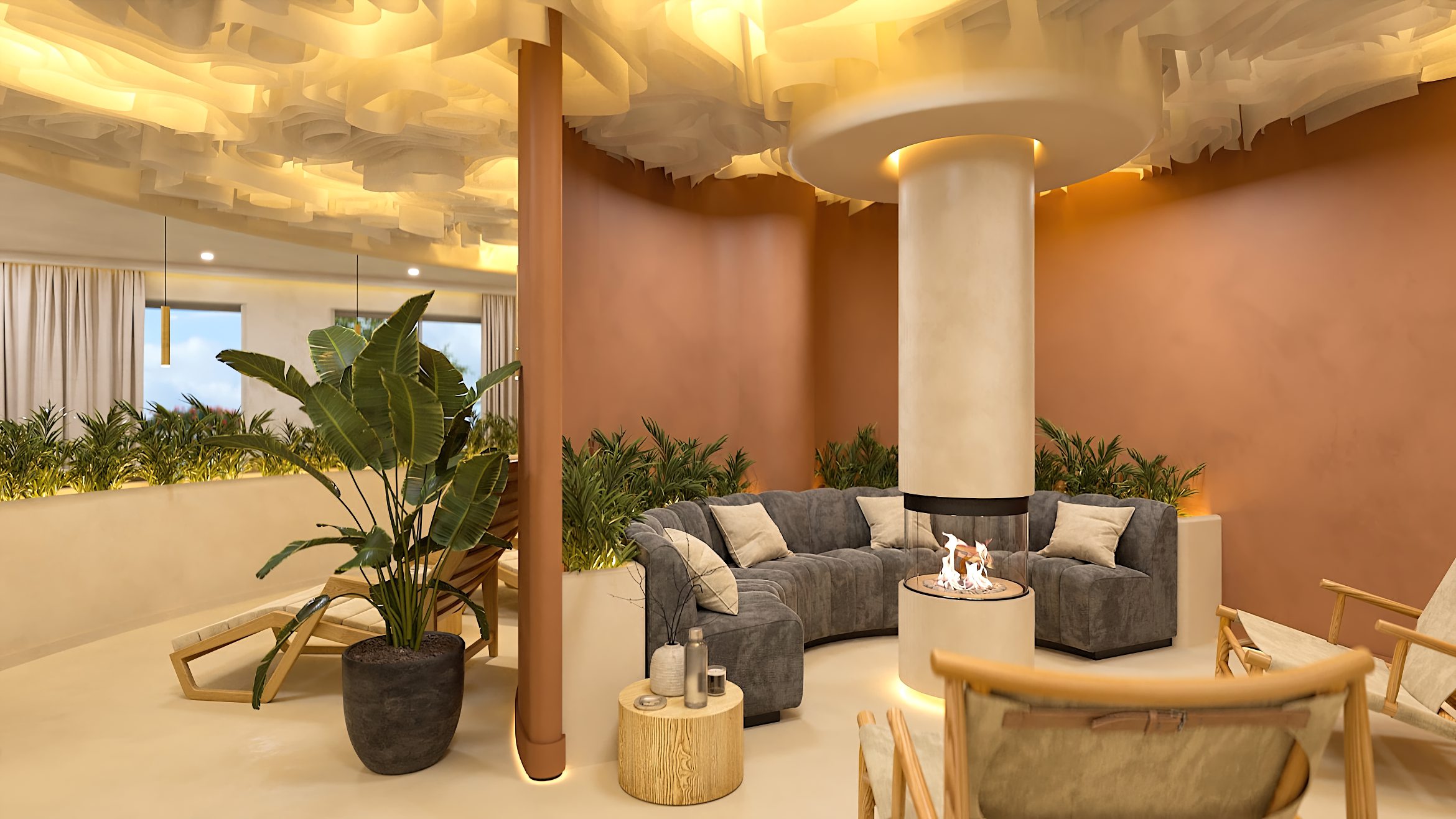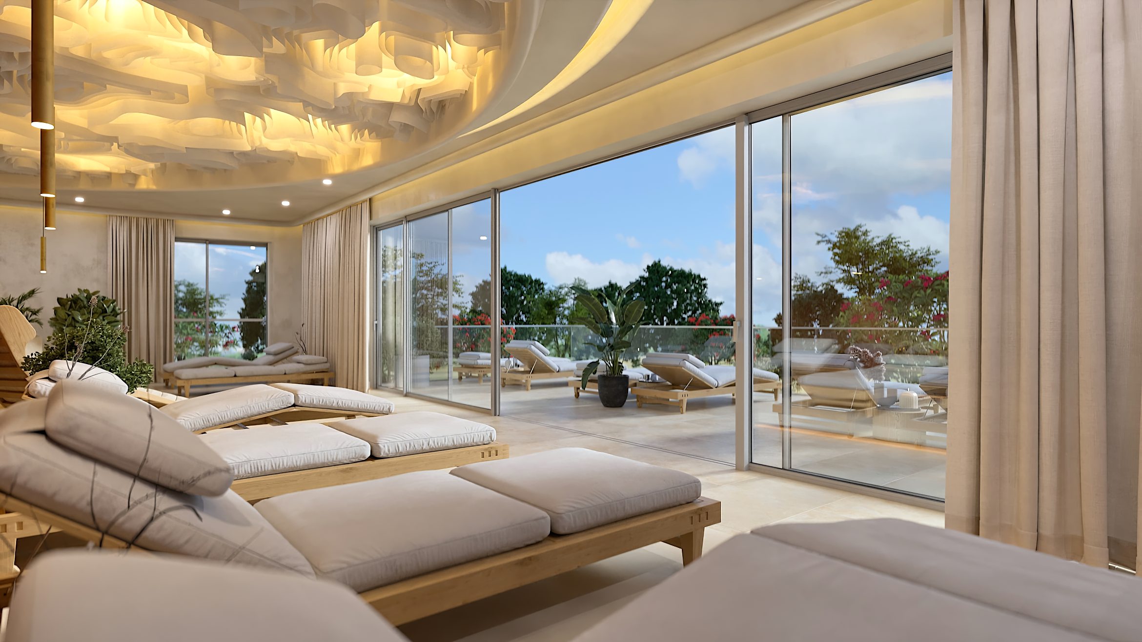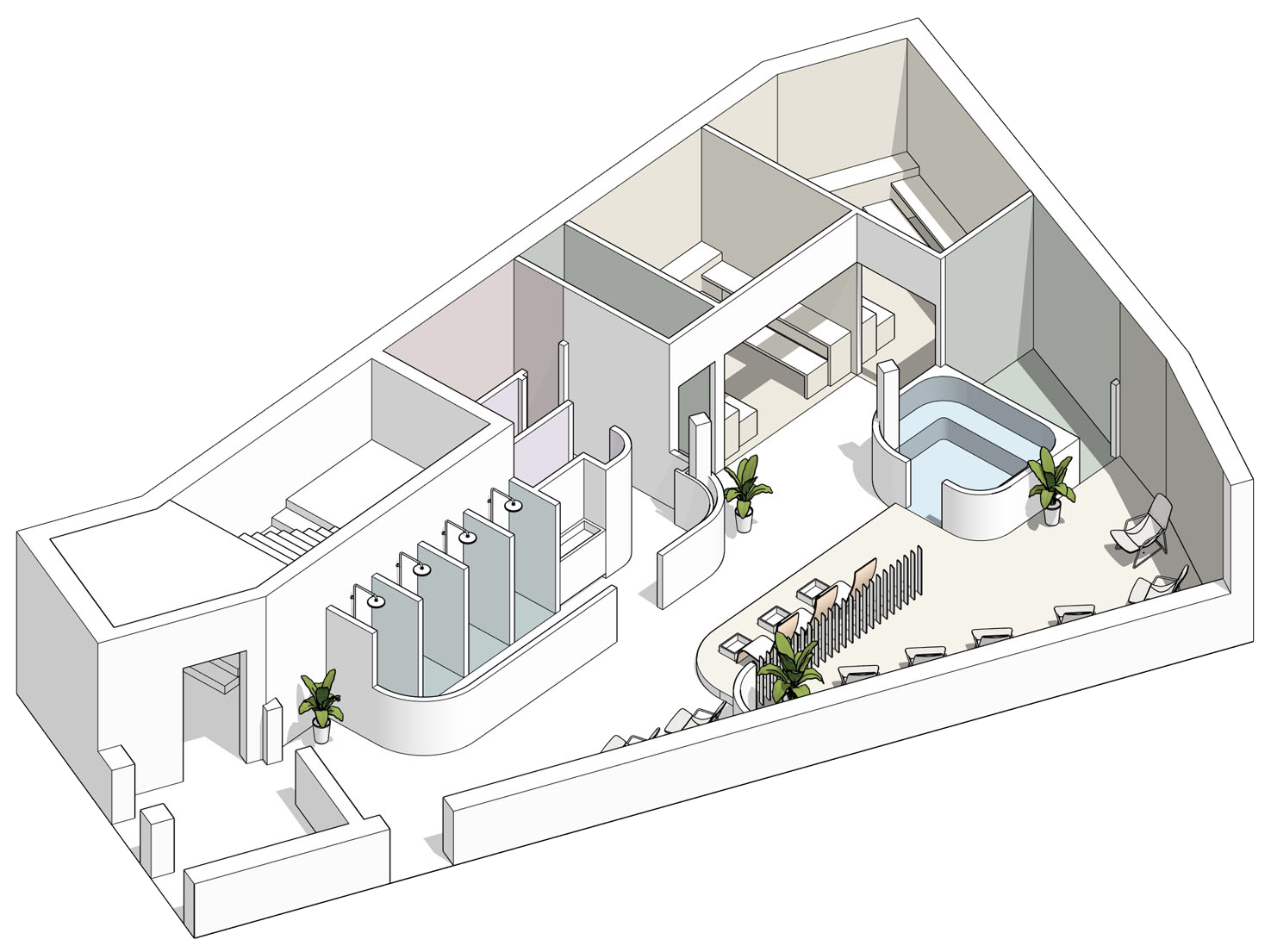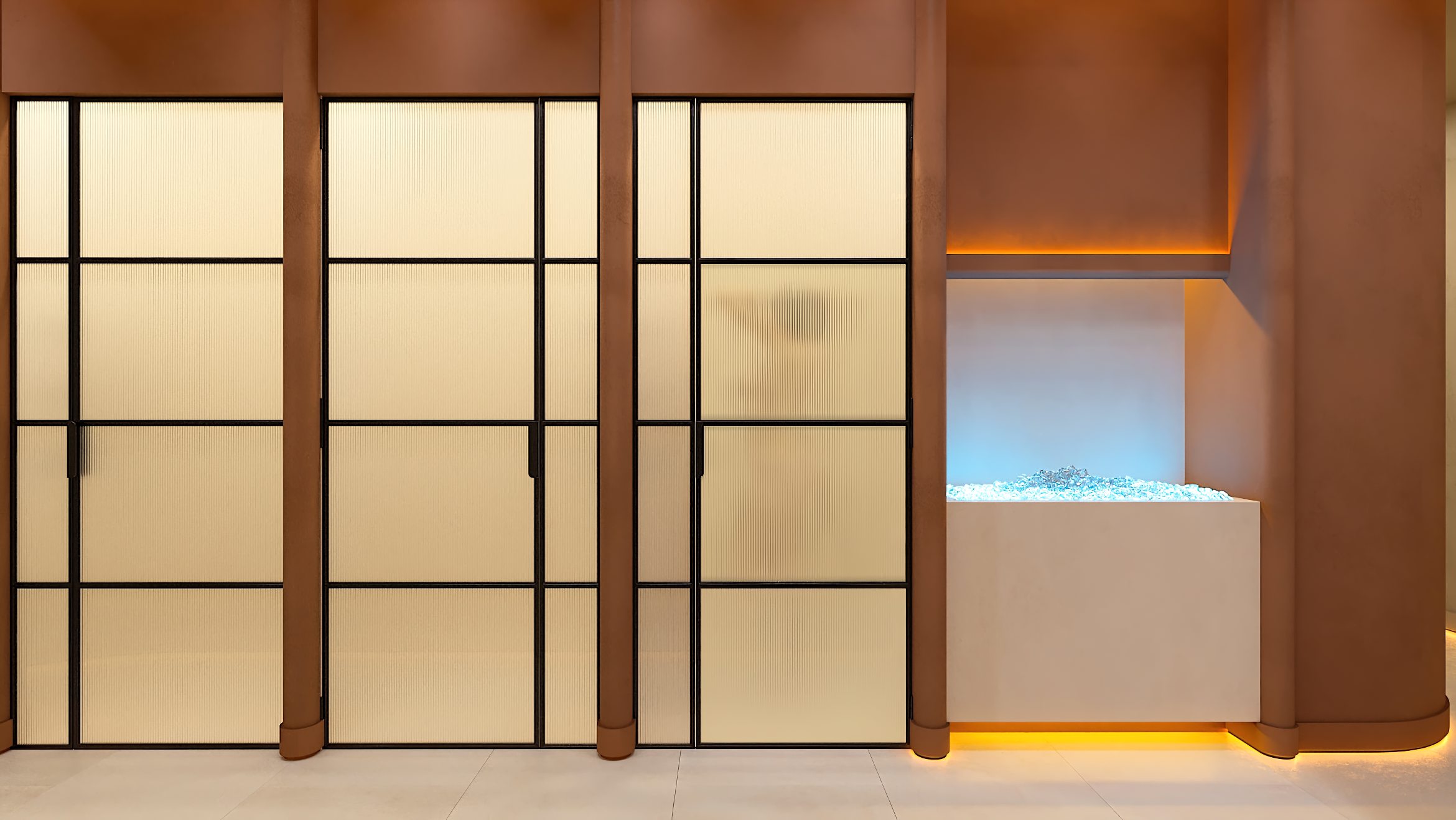 Die Formgebung des Raumes unterstreicht seinen umhüllenden Charakter. Abgerundete Linien, sanfte Kurven und fließende Übergänge in der Architektur und in der Inneneinrichtung erzeugen ein Gefühl von Geborgenheit und Harmonie und helfen den Gästen des SPA-Zentrums, sich vollständig in die Atmosphäre der Entspannung einzufinden.