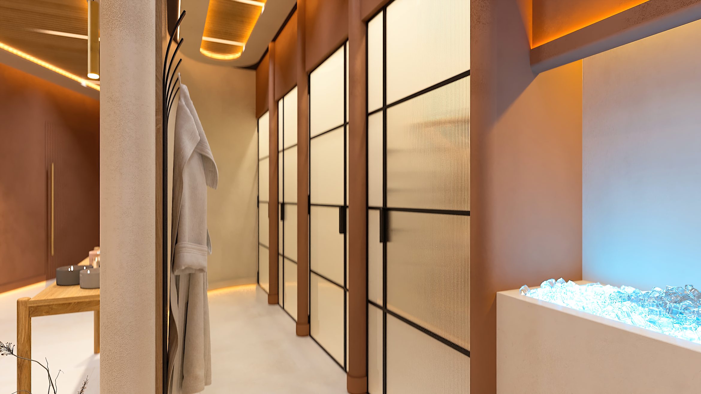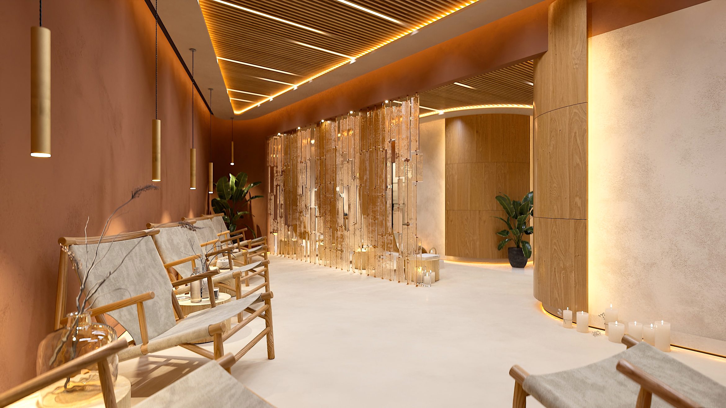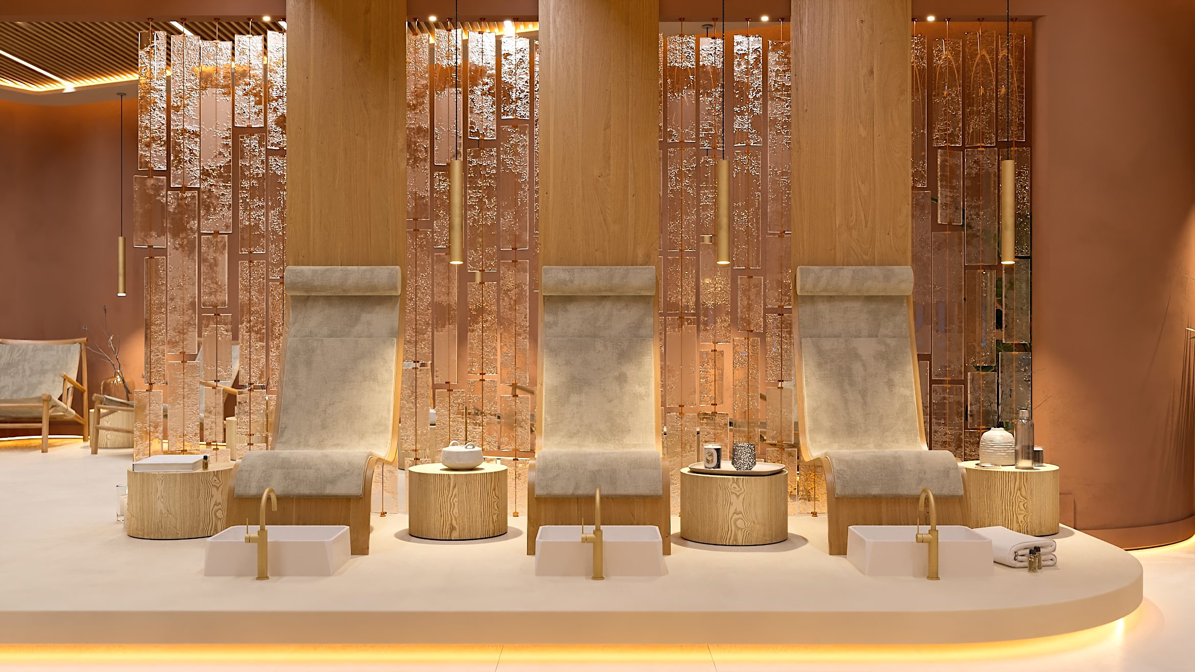 Das Gestaltungskonzept des Interieurs zielt darauf ab, dass jedes Element des Raumes zur Schaffung eines tiefen Gefühls von Ruhe und Verbundenheit mit der Natur beiträgt und den Besuch des SPA-Zentrums zu einem besonderen Ritual der Regeneration und inneren Harmonie macht.
